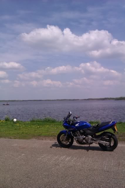 Op de terugreis weer via Giethoorn en de Blauwe Hand. Bij de Blauwe Hand nog even aan het water gezeten, waren m'n botten wel blij mee ;), en toen via Meppel en Koekange weer terug naar Hoogeveen. Nog net bij het tankstation gekomen met 265,5 km op de teller. Had verwacht dat hij dan wel in de reserve zou moeten, maar het lukte net. Getankt, wel 12,25 liter ofzo. Uiteindelijk liep hij 1 op 21,4. Ben heel benieuwd wat ie vanaf volgende week loopt. Zal wel wat minder worden denk ik. Uiteindelijk gister dus bijna 150 km gereden. Met de 130 van de dag daarvoor bijna 280 km dus!