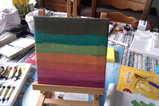 Na het eten heb ik ff een opzet gemaakt voor een nieuw schilderij. Dit moet natuurlijk eerst even drogen, maar heb morgen ook weer een hele dag om ermee verder te gaan. (Al heb ik nog wel wat andere dingen te doen, maar ik ben momenteel toch vroeg wakker). Ik wilde een mooi kleurverloop maken, is natuurlijk niet helemaal zoals ik het wilde, maar toch. Kleuren mengen ben ik nog niet zo goed in. Al ben ik op zich wel tevreden met het resultaat. Het staat zo eigenlijk op z'n kop, maar wat nu boven is was nog niet droog, en dat wat nu onder is wel. Hier komt uiteindelijk nog weer wat overheen.