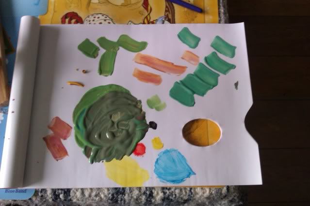 De kleurtjes van de vorige keer kun je zelfs nog zien. Die zitten dus midden onder, die 4 kleinere vlekjes :D. Die hele grote vlek, en de veegjes zijn van vandaag. Wel erg, heb nu het grootste deel van m'n tubetjes bijna leeg. En dat na 1 echte sessie :O.